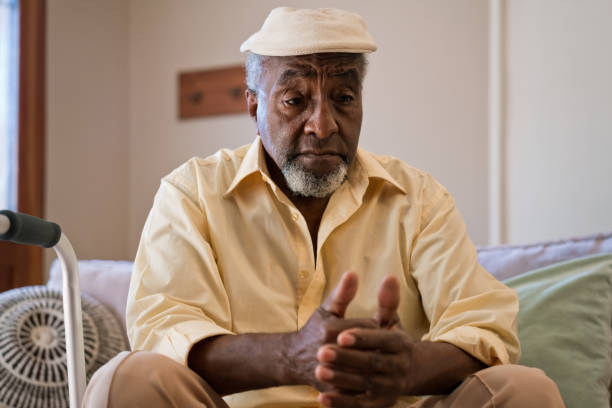 Depressed senior man in living room. Elderly male is looking down while sitting on sofa. He is wearing cap at home