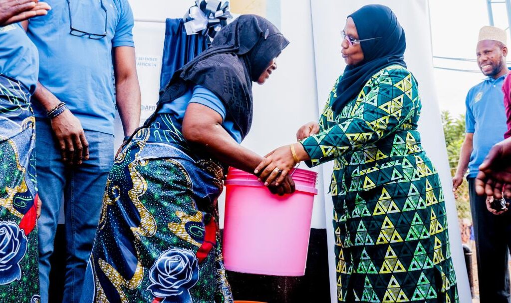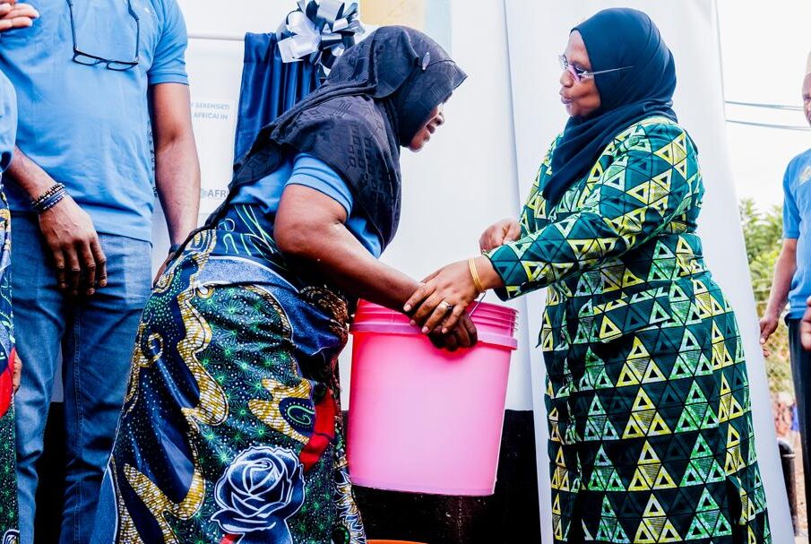 Waziri wa Mifugo na Uvuvi na Mbunge wa Jimbo la Kondoa Mheshimiwa Dkt Ashantu Kijaji (kulia) akimkabidhi ndoo ya maji mmoja wa wananchi wa Kwadelo kama Ishara ya kukabidhi Mradi wa maji uliofadhiliwa na Kampuni ya Serengeti Breweries Limited (SBL) Ikiwa ni sehemu ya kusaidia serikali kupunguza changamoto za maji safi na salama nchini. Tukio hilo limefanyika tarehe 26 mwezi Juni 2025 katika kata ya Kwadelo, Wilayani Kondoa – Dodoma.