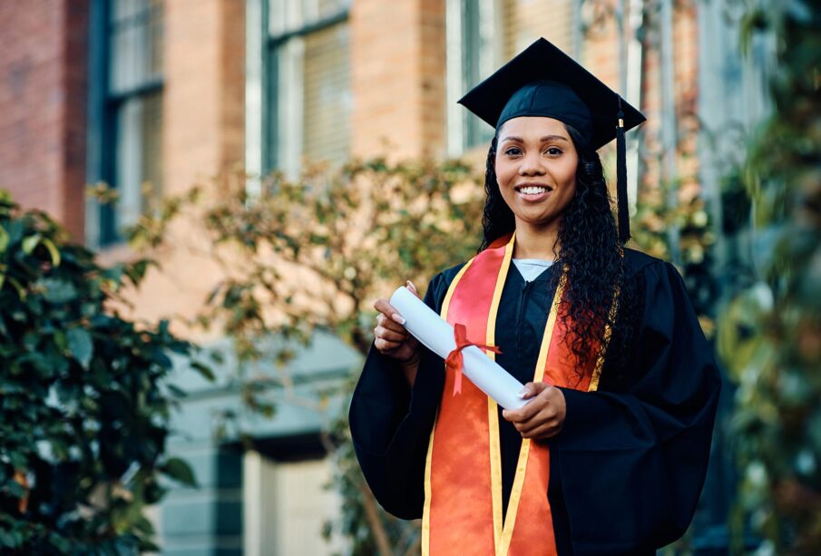 Happy African American female student holding her diploma on graduation day and looking at camera. Copy space.