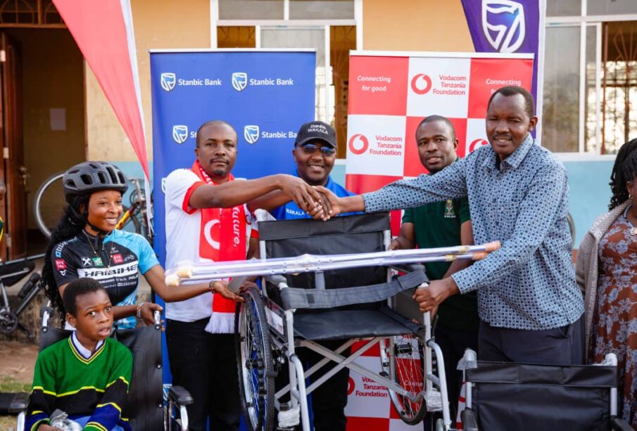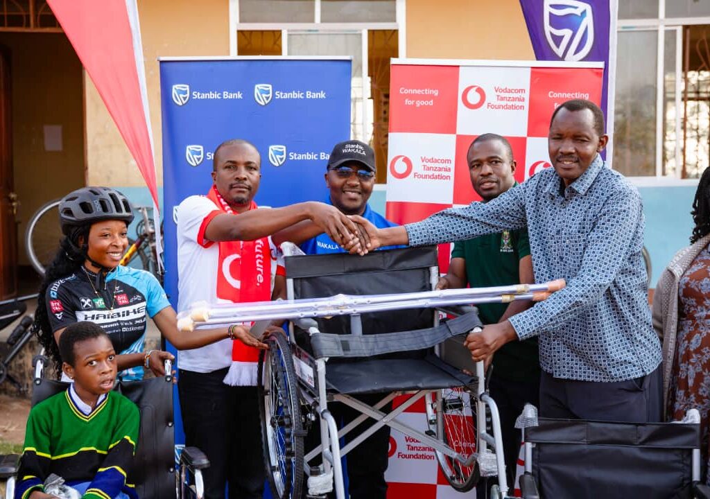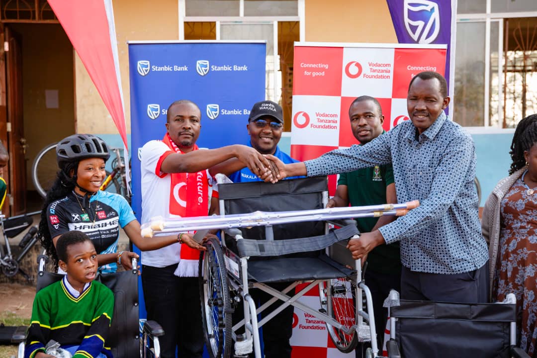 Meneja Mauzo Mwandamizi wa Vodacom Tanzania Plc Kanda ya Ziwa, Straton Mchau ( wa pili kushoto) pamoja na Meneja wa Benki ya Stanbic Tanzania Tawi la Mwanza Geoffrey Makondo wakikabidhi moja ya viti Mwendo 4 kwa Afisa elimu maalum – Halmashauri ya mji wa Bariadi Rutherford Magayane (kulia) na mkuu wa shule ya Msingi Sima A Mwl Adalbert Chambia ( wa pili kulia )katika shule ya Msingi Sima A, wilayani Bariadi mkoani Simiyu.